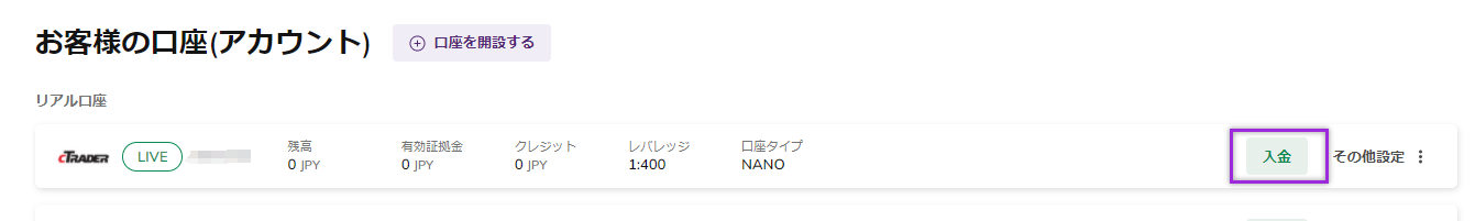 各口座の右側にある「入金」をクリックすると、入金希望のJPY口座を選択できます。