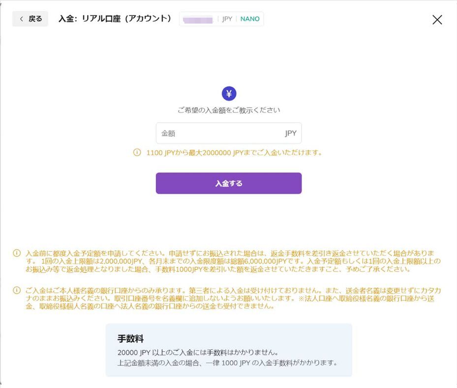 また、ほとんどの入金方法で2万円未満の入金時には1,000円(国際銀行送金は1,500円)の手数料が発生するため、少額入金には注意が必要です。