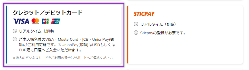 入金方法一覧ページの中から、クレジットカード/デビットカードをお選びください。