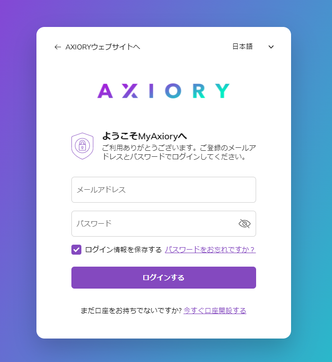 【MyAxiory】にアクセスし、「メールアドレス」と「パスワード」にご登録情報を入力して、「ログインする」ボタンをクリックしてください。