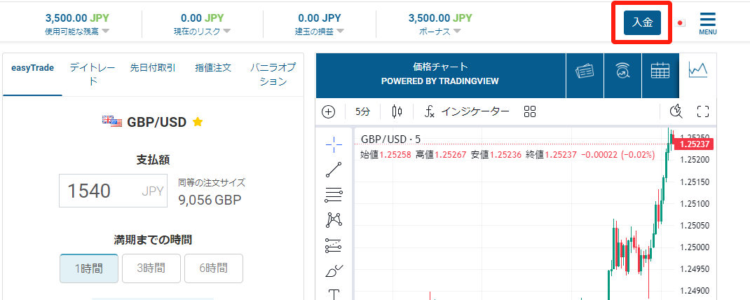 まずは、easyMarketsへログインし、画⾯右上の「⼊⾦」をクリックします。