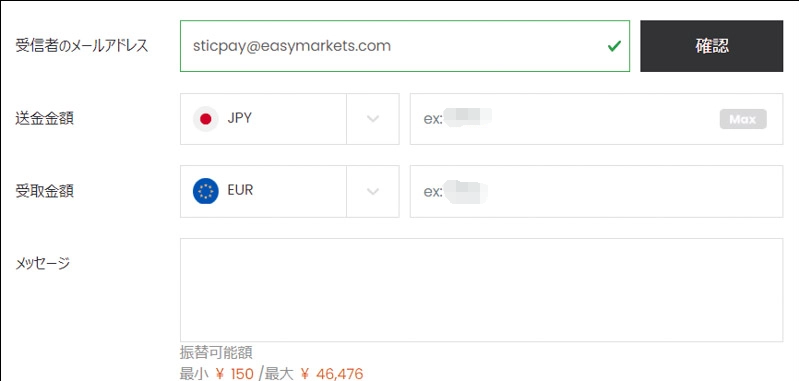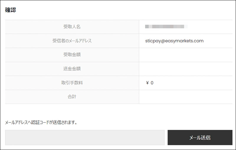 easyMarketsの指定したメールアドレスと⼊⾦額を⼊⼒します。