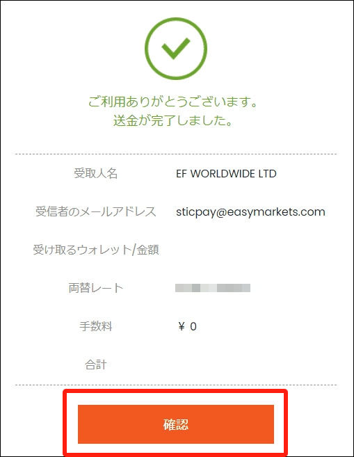 以下の画⾯が表⽰されたら、STICPAY⼊⾦を完了します。