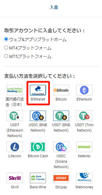 ⼊⾦ページで、取引アカウントを選択し、⽀払い⽅法から「bitwallet」を選んでください。