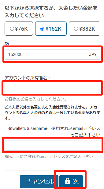 「⼊⾦額」、「アカウントの所有者名」とbitwalletのメールアドレスを⼊⼒します。