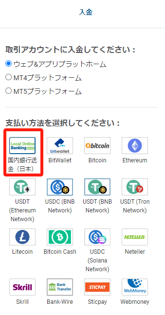 ⼊⾦ページで、取引アカウントを選択し、⽀払い⽅法から「国内銀⾏送⾦」を選んでください。