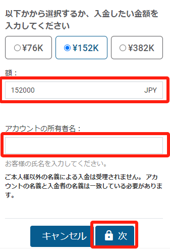「⼊⾦額」と「アカウントの所有者名」を⼊⼒します。