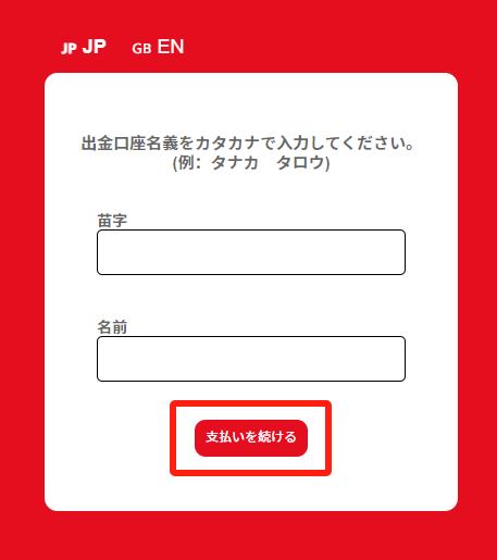 ⼝座名義をカタカナで⼊⼒し、「⽀払いを続ける」をクリックします。