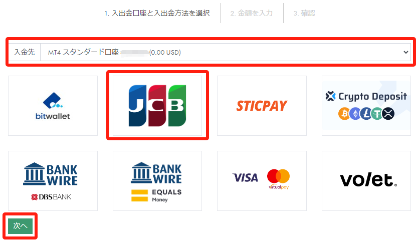 「⼊⾦先」の⼝座を選択し、⼊⾦⽅法⼀覧から「JCB」を選び、「次へ」をクリックします。