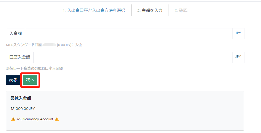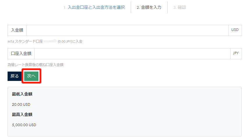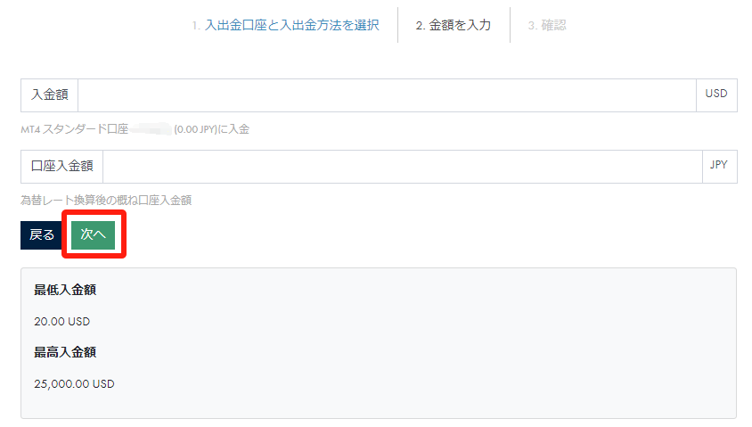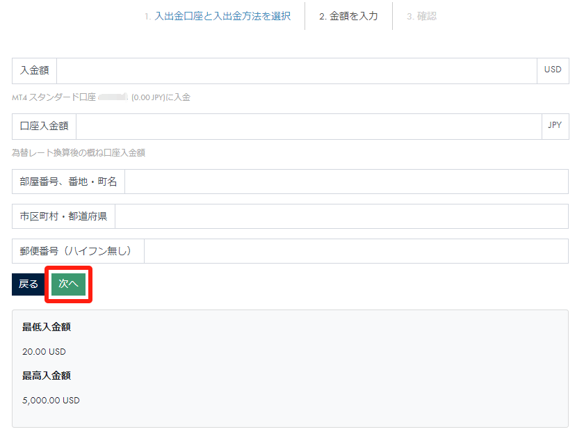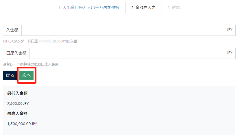 「⼊⾦額」を円で⼊⼒し、「次へ」をクリックします。