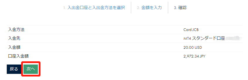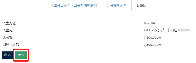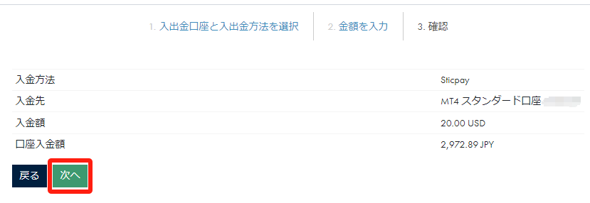 ⼊⾦情報を確認し、「次へ」をクリックします。