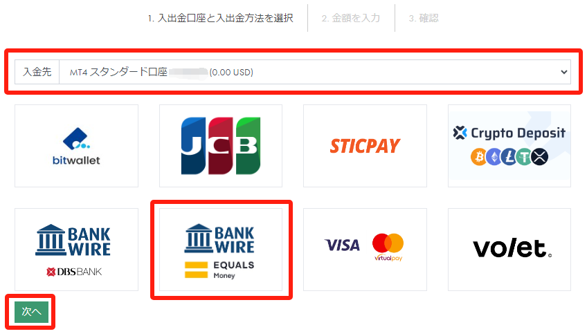 「⼊⾦先」の⼝座を選択し、⼊⾦⽅法⼀覧から「銀⾏振込(Bank Wire)」を選び、「次へ」をクリックします。