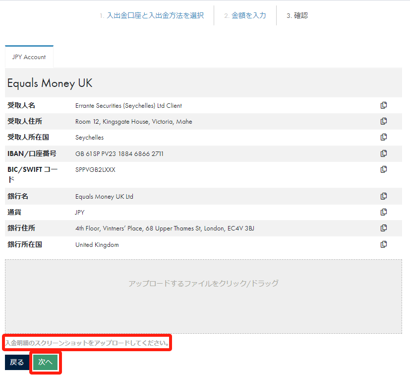 振込先の銀⾏情報が表⽰されます。銀⾏情報を確認し、⼊⾦明細のスクリーンショットをアップロードし、「次へ」をクリックします。