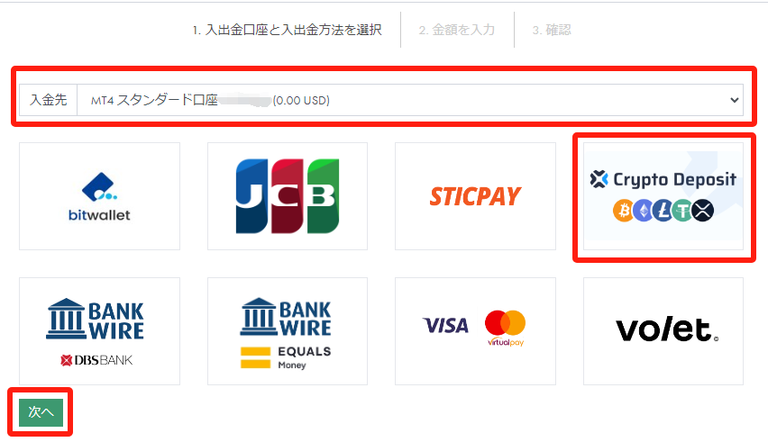「⼊⾦先」の⼝座を選択し、⼊⾦⽅法⼀覧から「Crypto Deposit」を選び、「次へ」をクリックします。