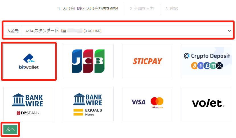 「⼊⾦先」の⼝座を選択し、⼊⾦⽅法⼀覧から「bitwallet」を選び、「次へ」をクリックします。
