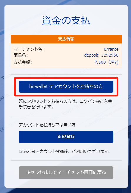 「次」ボタンを押した後、eWalletアカウントをお持ちの場合は、「bitwalletにアカウントをお持ちの⽅」をクリックします。