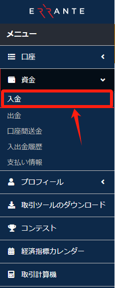 次に、左側のメニューにある「資⾦」下での「⼊⾦」をクリックします。