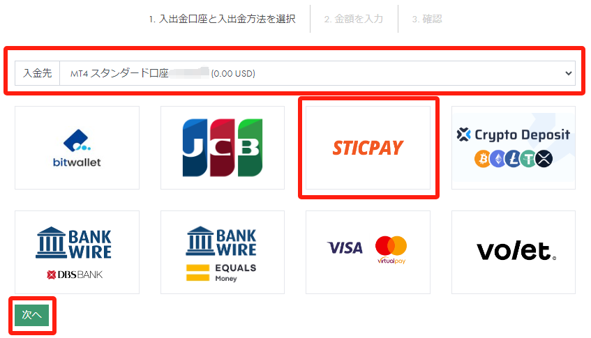 「⼊⾦先」の⼝座を選択し、⼊⾦⽅法⼀覧から「STICPAY」を選び、「次へ」をクリックします。