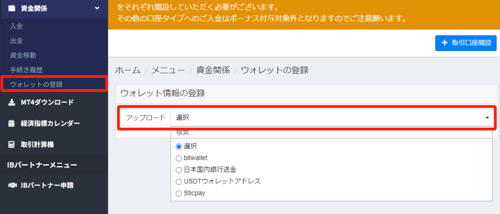 マイページにログインし、左側メニューから「ウォレットの登録」を選択します。