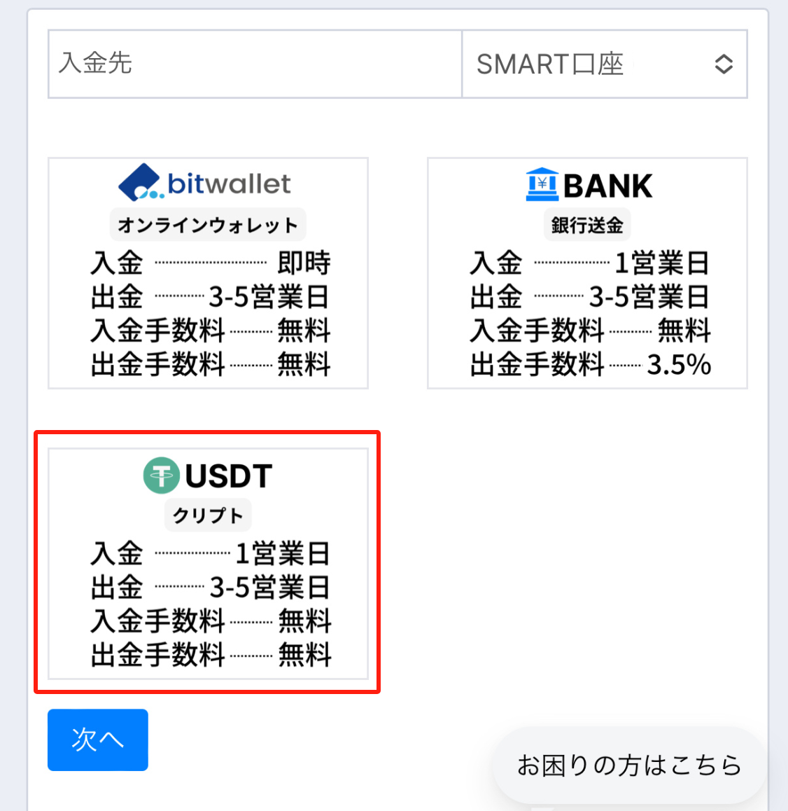 ⼊⾦⽅法⼀覧から「USDT」を選択してください。