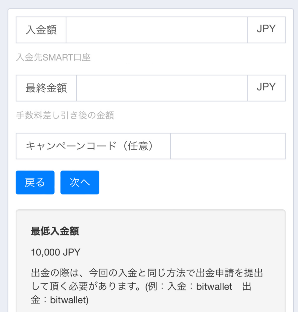 | 入金方法 | 最小入金額 | 反映時間 | 手数料 |