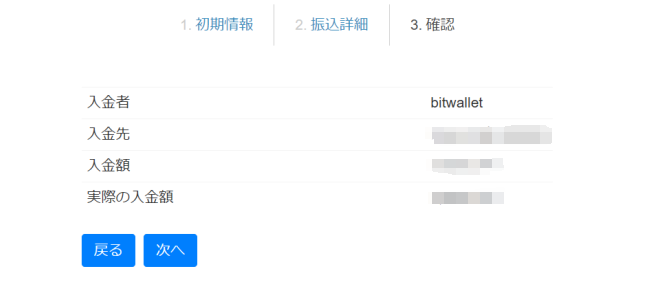 「次へ」をクリックすると、以下の画⾯が表⽰され、⼊⾦情報の確認が⾏われます。