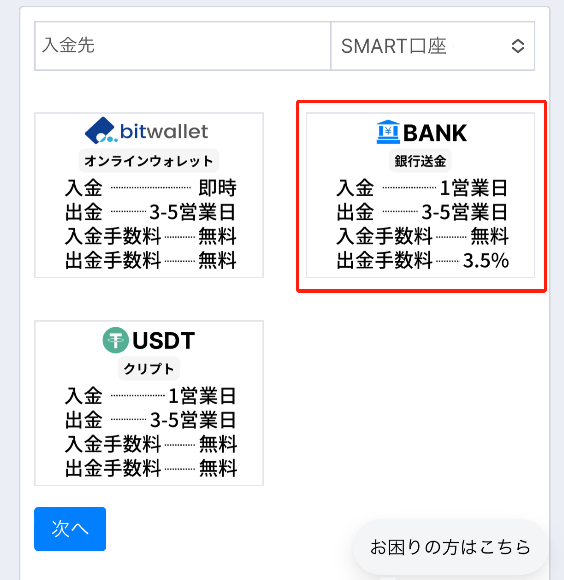 | 国内銀行送金 | 30,000円 | 1営業日 | なし |