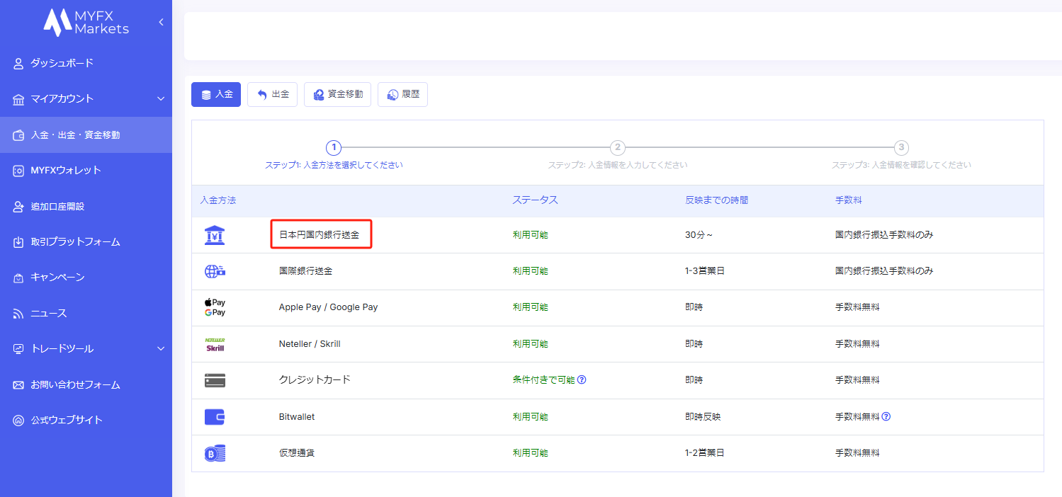 MYFXMarketsでは、現在7種類の入金方法をご利用いただけます。各入金方法により、反映時間や手数料が異なりますので、以下の情報を参考に、ご自身に最適な方法をお選びください。