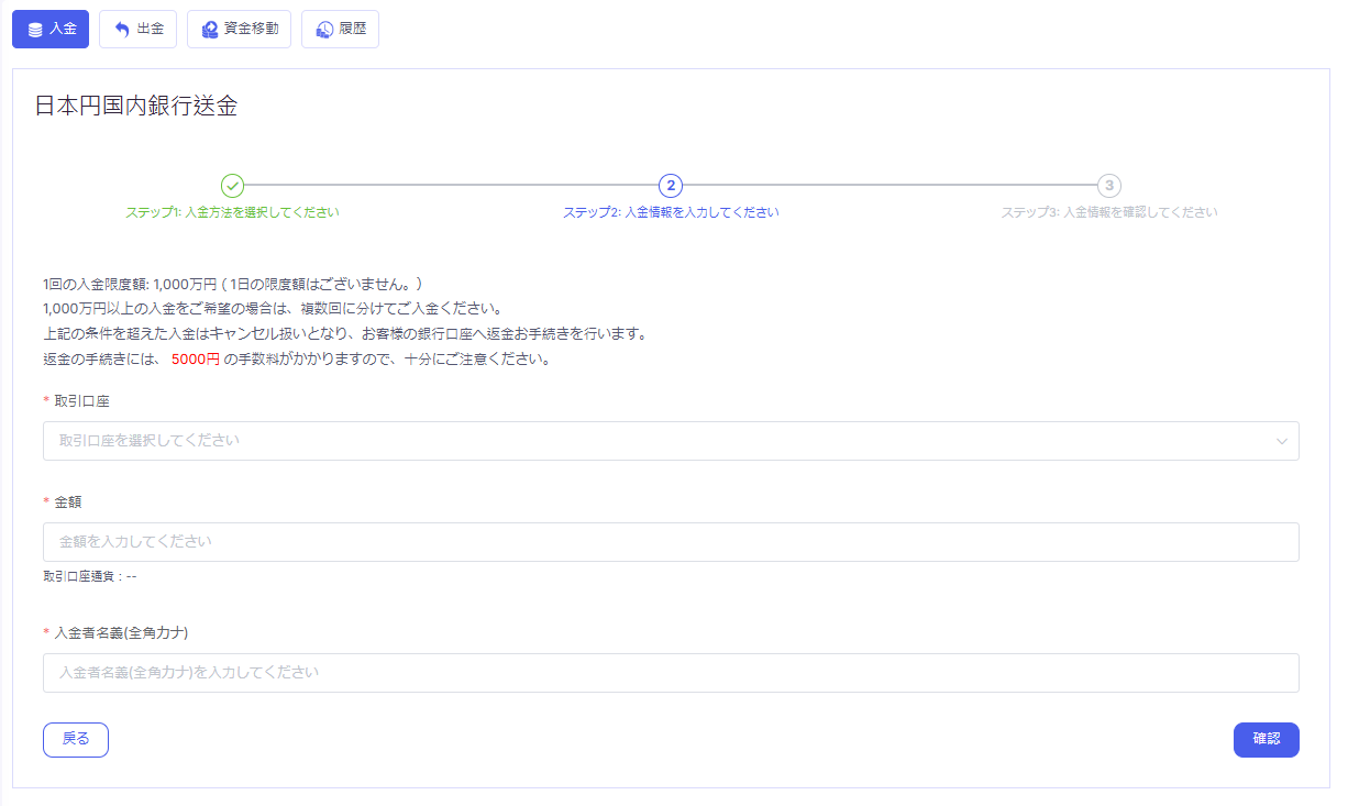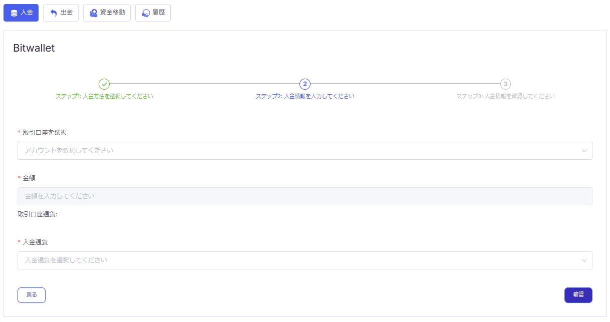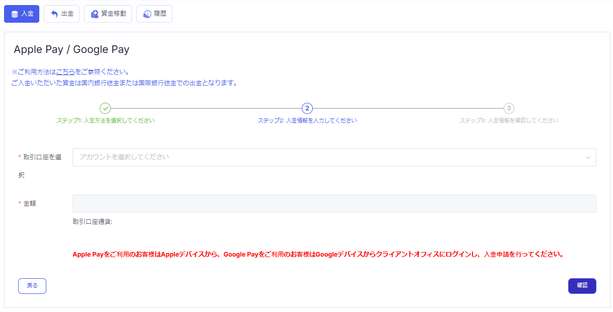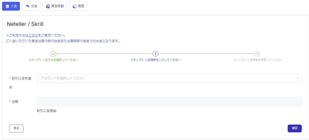 取引口座を選択し、「金額」を入力した後、「入金通貨」を選択して「確認」ボタンをクリックしてください。