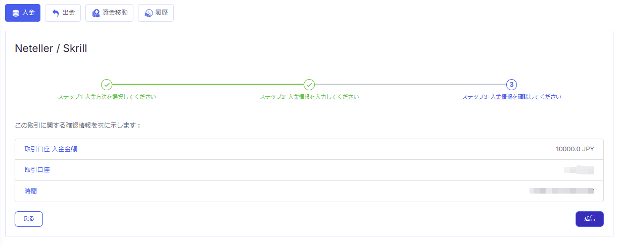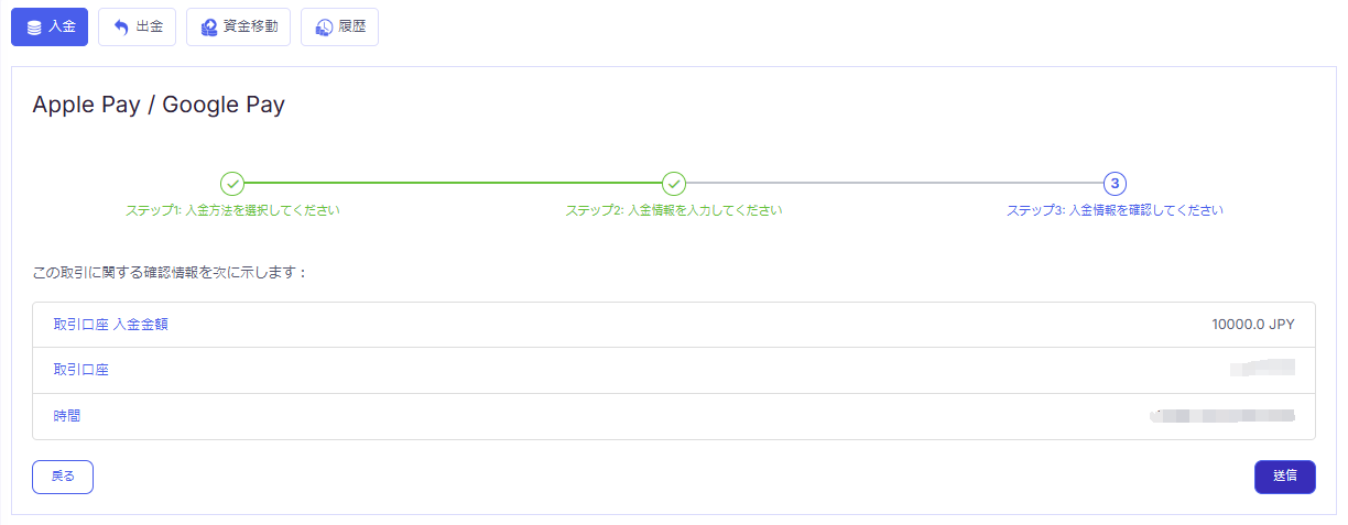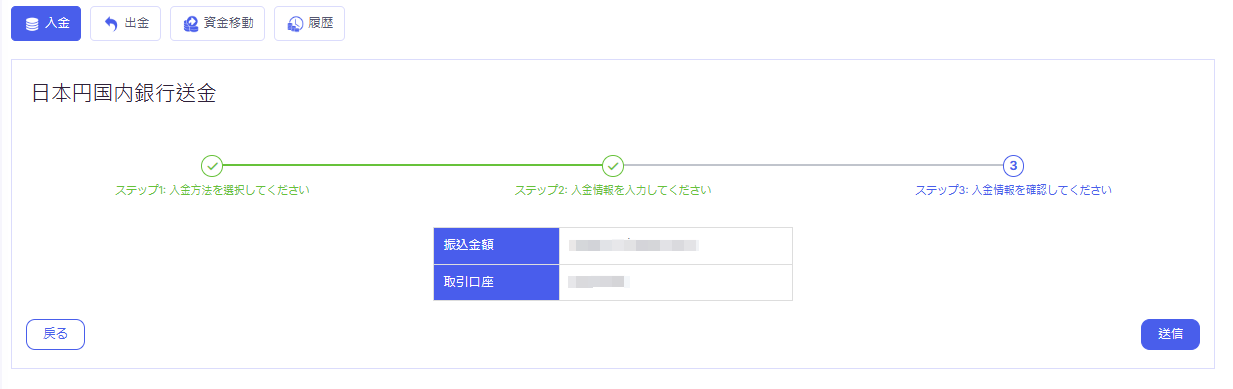 入金の内容を確認し「送信」をクリックします。