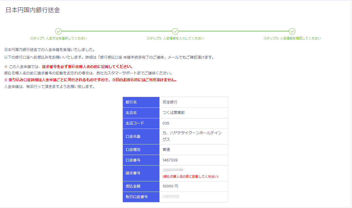 口座情報を確認し、指定された口座へ入金を行ってください。