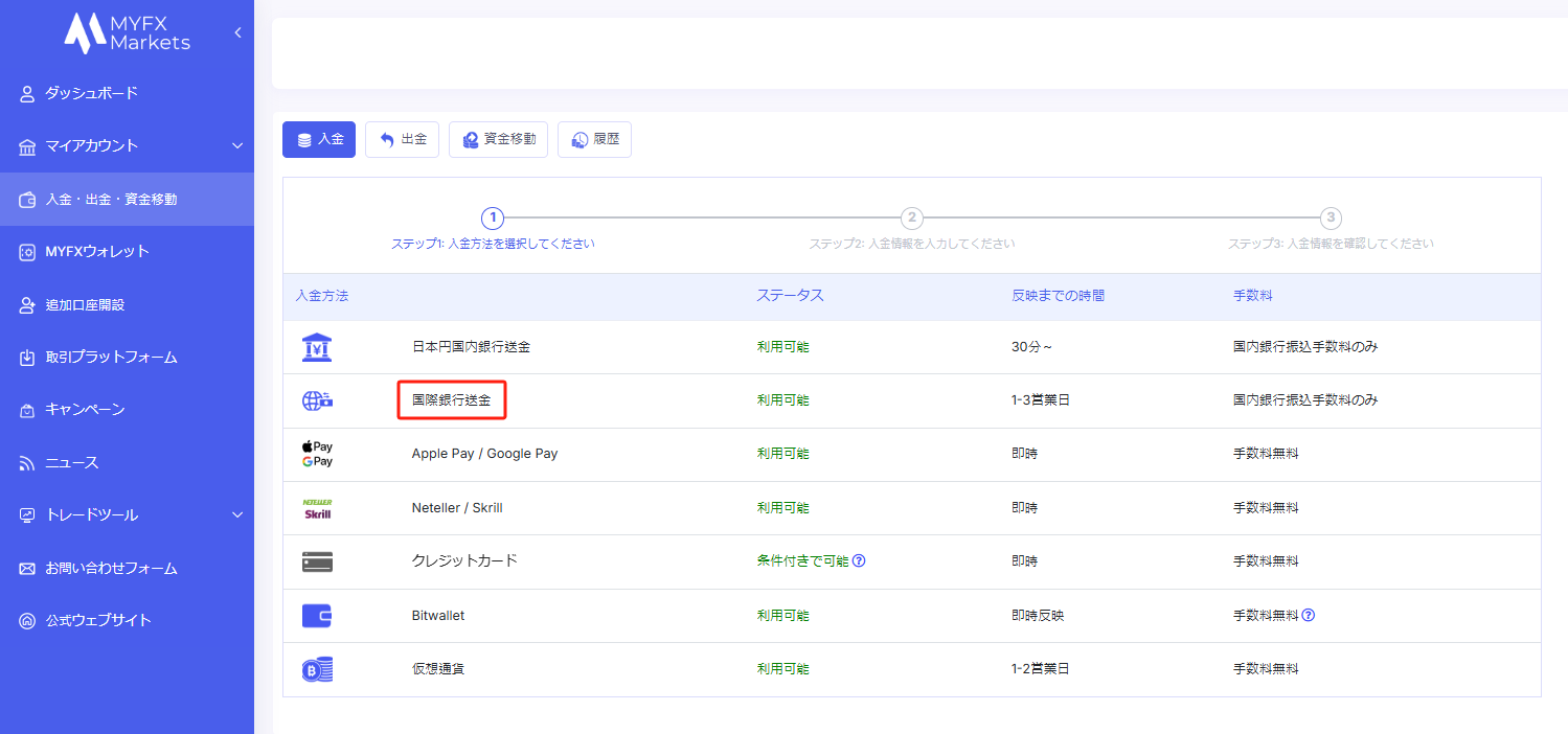 ログイン後、左側のメニューから「入金・出金・資金移動」を選択してください。 その後、入金方法の一覧から「国際銀行送金」を選択してください。