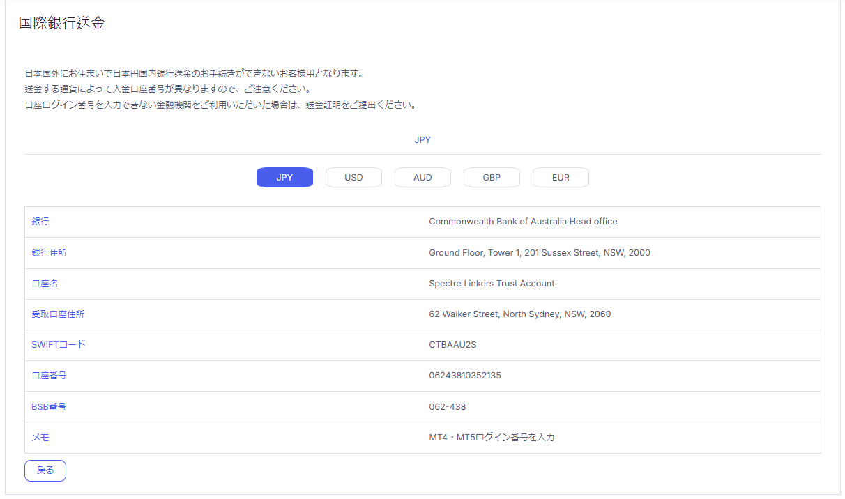 表示される銀行情報をもとに、入金は日本円のほか、USD、EUR、AUD、GBPにも対応しています。 通貨によって、指定された口座番号が異なるのでご確認ください。 銀行窓口またはオンラインバンキングで指定の口座に送金すれば、海外送金の入金手続きは完了します。