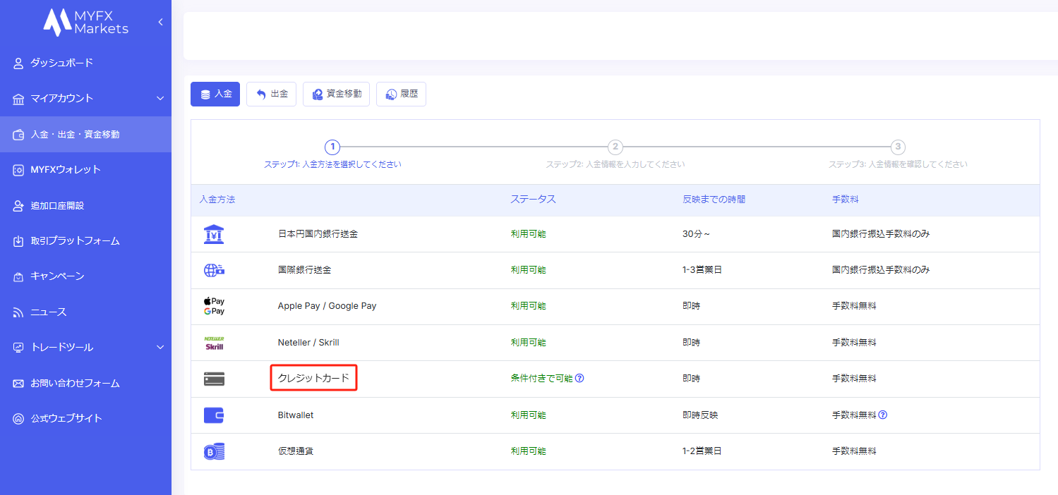 ログイン後、左側のメニューから「入金・出金・資金移動」を選択してください。 その後、入金方法の一覧から「クレジットカード」を選択してください。
