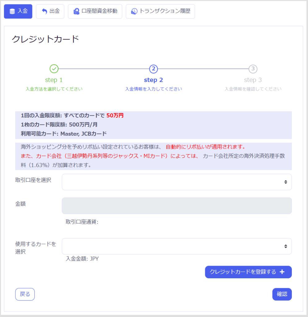 すでにカードを登録している方は、まず「取引口座」を選択し、「金額」を入力します。その後、使用するカードを選び、「確認」ボタンをクリックしてください。