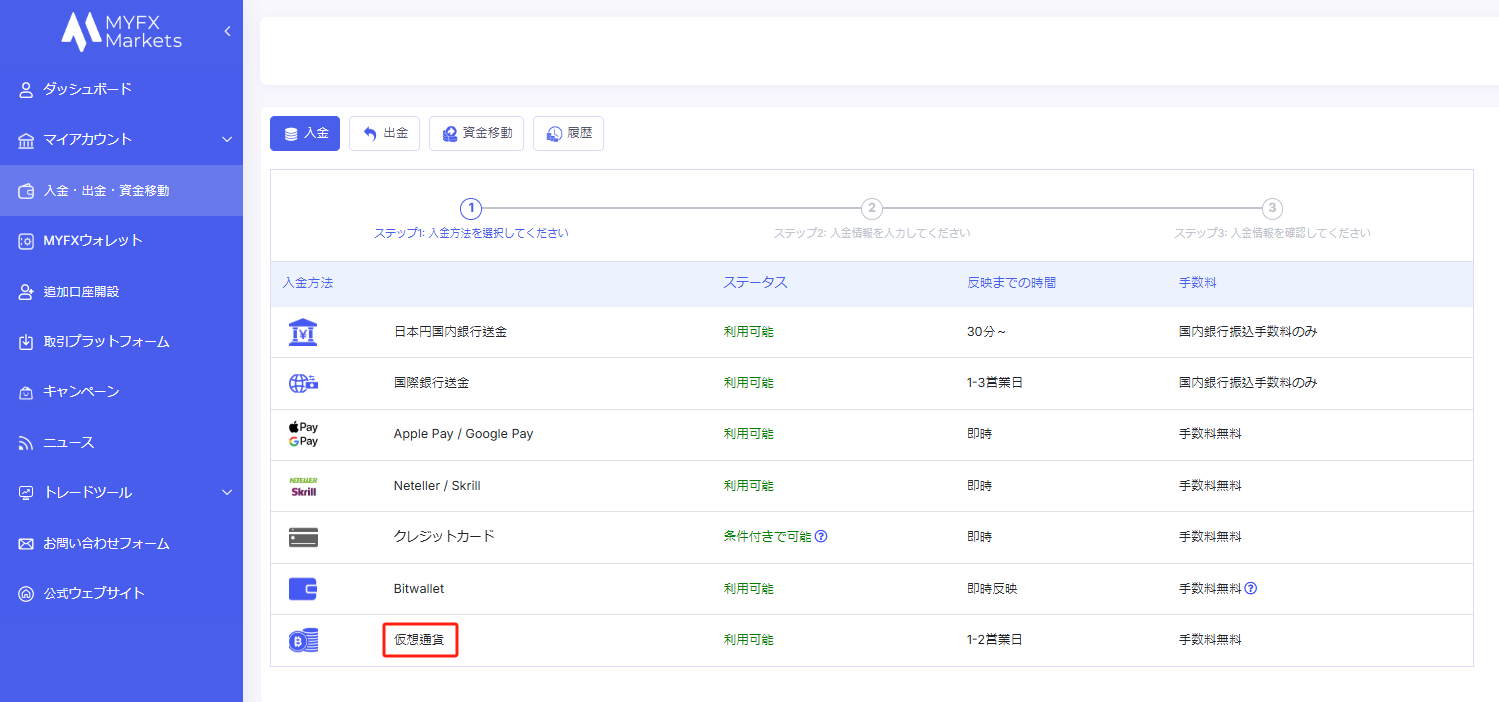 ログイン後、左側のメニューから「入金・出金・資金移動」を選択してください。 その後、入金方法の一覧から「仮想通貨」を選択してください。