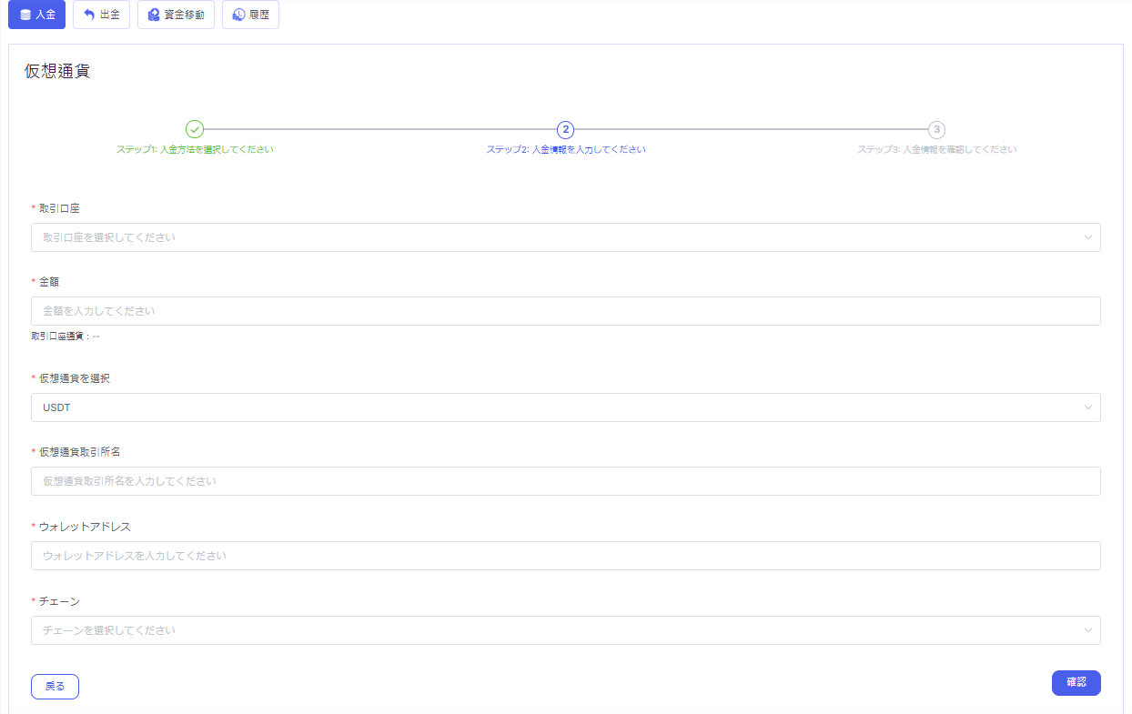 取引口座を選んで「金額」を入力し、その後、仮想通貨を選択します。 「仮想通貨取引所名」と「ウォレットアドレス」を入力したら、「確認」ボタンをクリックしてください。