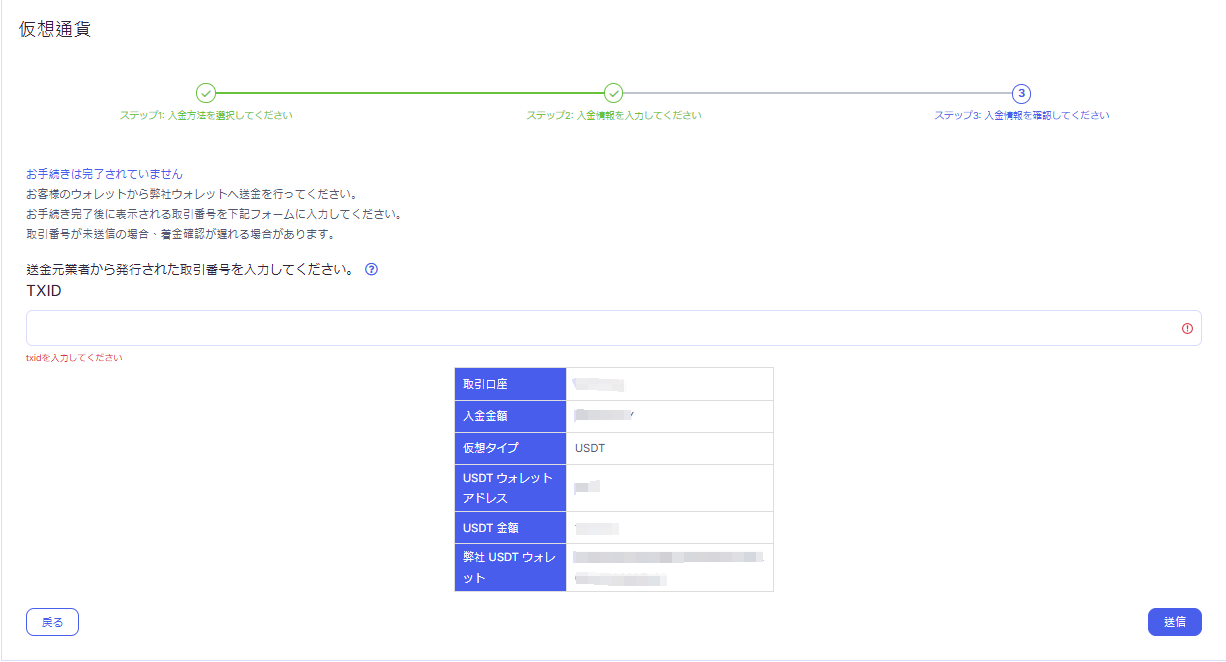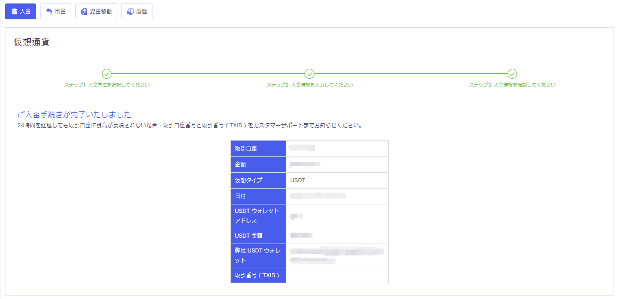 入金内容を確認し、問題がなければ仮想通貨による入金が完了します。