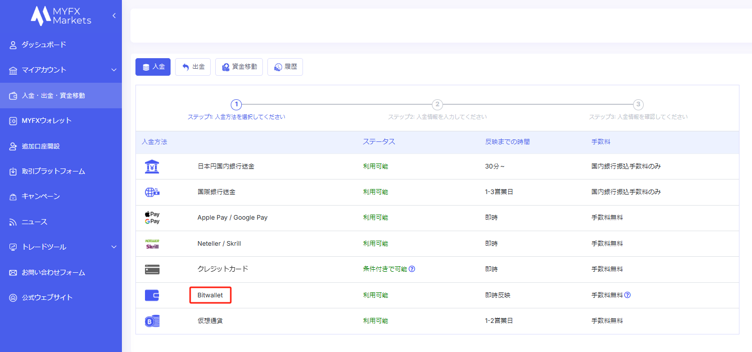 ログイン後、左側のメニューから「入金・出金・資金移動」を選択してください。 その後、入金方法の一覧から「Bitwallet」を選択してください。