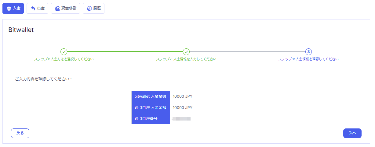 入金の内容を確認し「次へ」をクリックします。