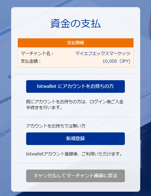 bitwalletにログイン後、送金内容を確認し、「決済する」ボタンをクリックすれば、bitwalletによる入金申請が完了します。
