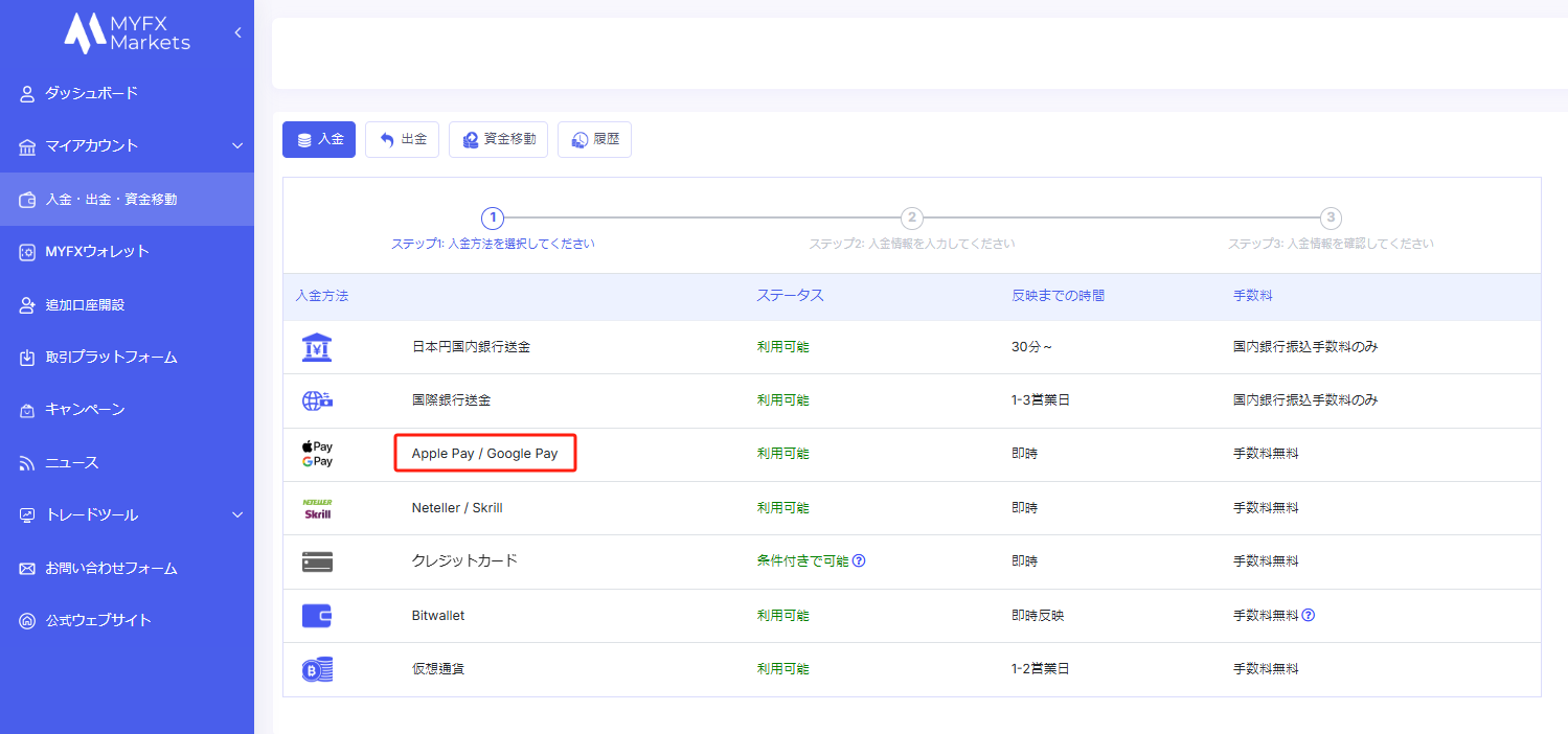 ログイン後、左側のメニューから「入金・出金・資金移動」を選択してください。 その後、入金方法の一覧から「Apple Pay / Google Pay」を選択してください。