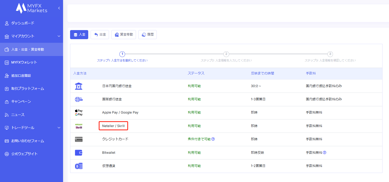ログイン後、左側のメニューから「入金・出金・資金移動」を選択してください。 その後、入金方法の一覧から「Neteller / Skrill」を選択してください。