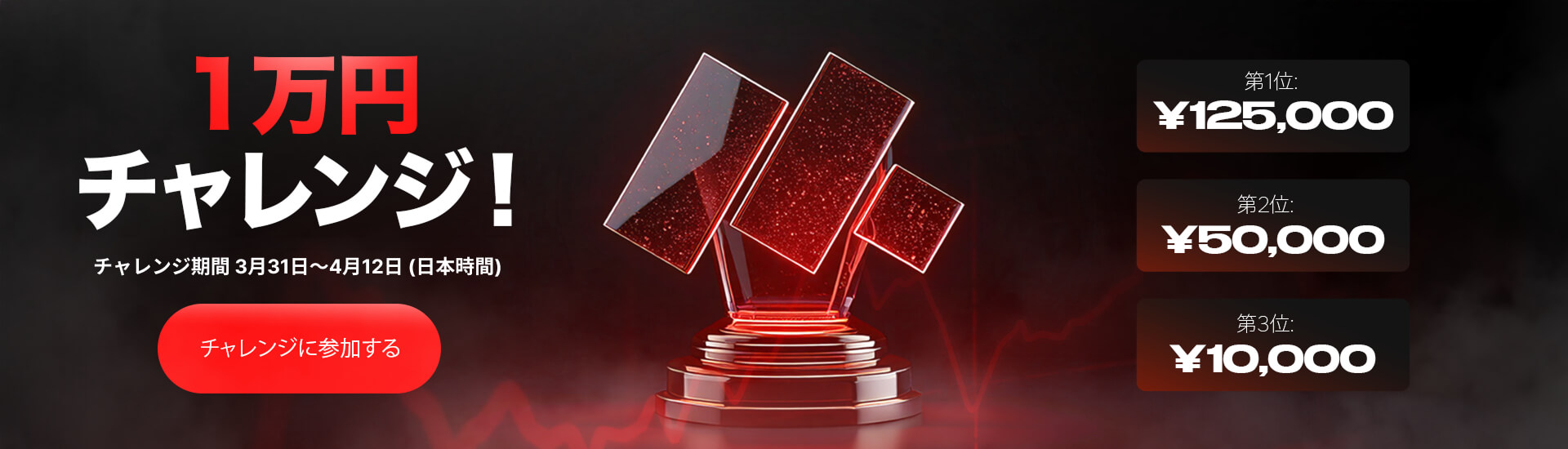 マイページの「FX チャレンジ」からエントリーし、レバレッジ1,000倍の専⽤チャレンジ⼝座に1万円を⼊⾦することで参加可能です。