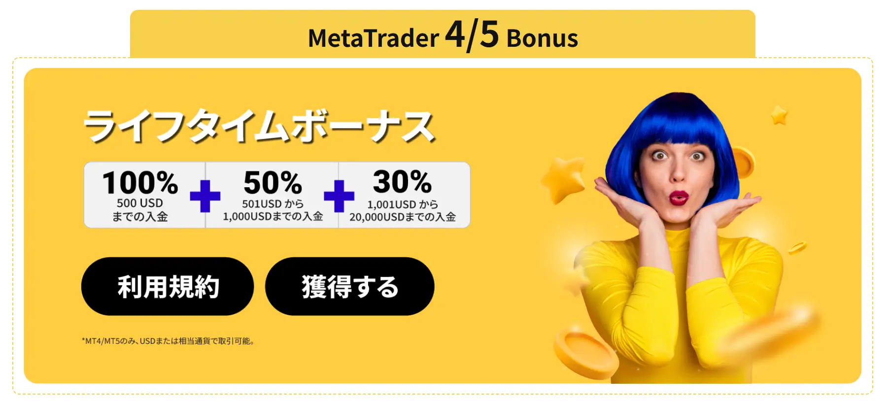 100%(500ドルまでの入金) 50%(501ドルから1,000ドルまでの入金) 30%(1,001ドルから20,000ドルまでの入金) |