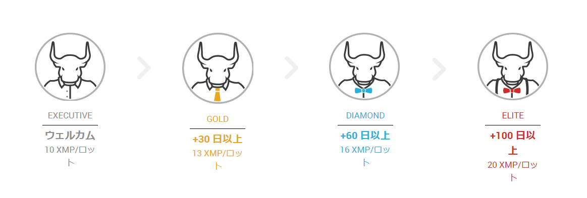 ロイヤルティステータスのアップグレード毎に、1ロットにつき獲得頂けるXMP(XMTradingポイント)の数も比例して増加する仕組みです。
