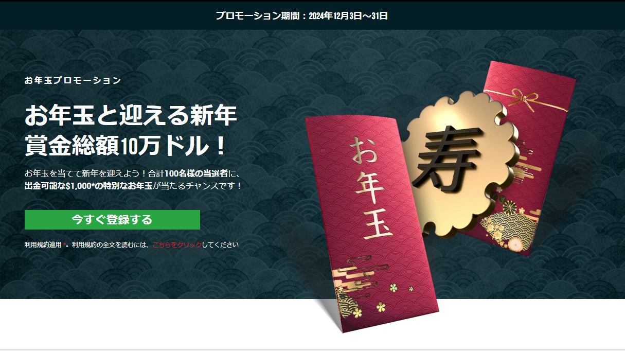 ● 口座開設日から30日以内にボーナスの請求をしないと無効 ● ボーナスは直接出金できない ● 獲得した利益はいつでも出金可能ですが、出金の際に出金額に応じた相応額の取引ボーナスが消失する |