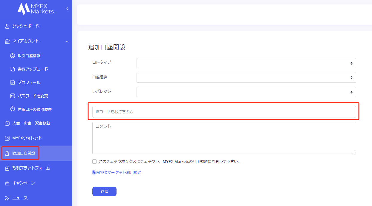 クライアントオフィスにログイン後、左側の「追加口座開設」をクリックし、追加口座を設定してください。