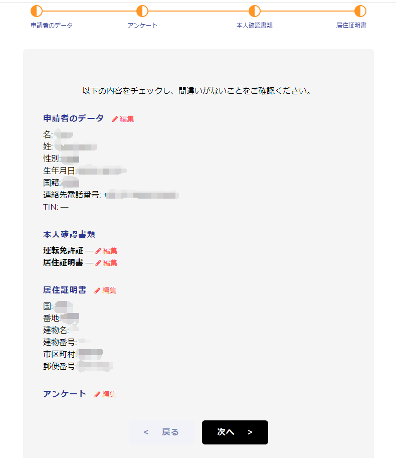 次は申請者データの⼊⼒ページです。⼊⼒する個⼈情報は、後にアップロードする「⾝分証明書」の内容と⼀致させる必要があります。