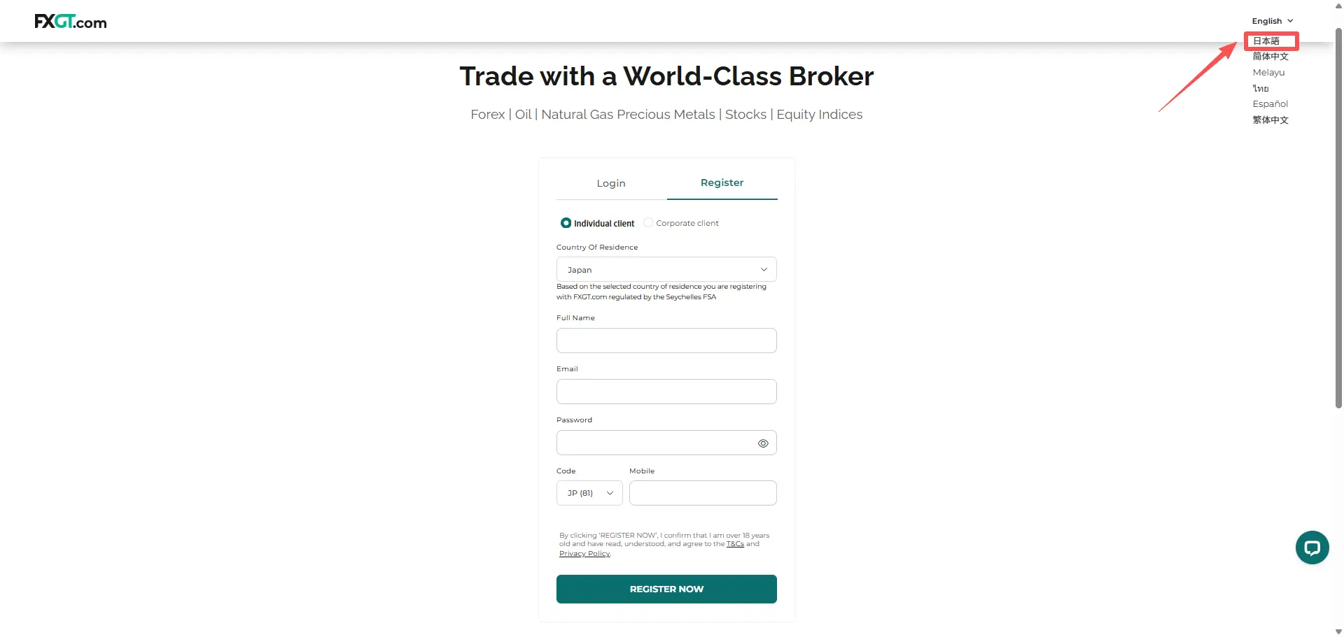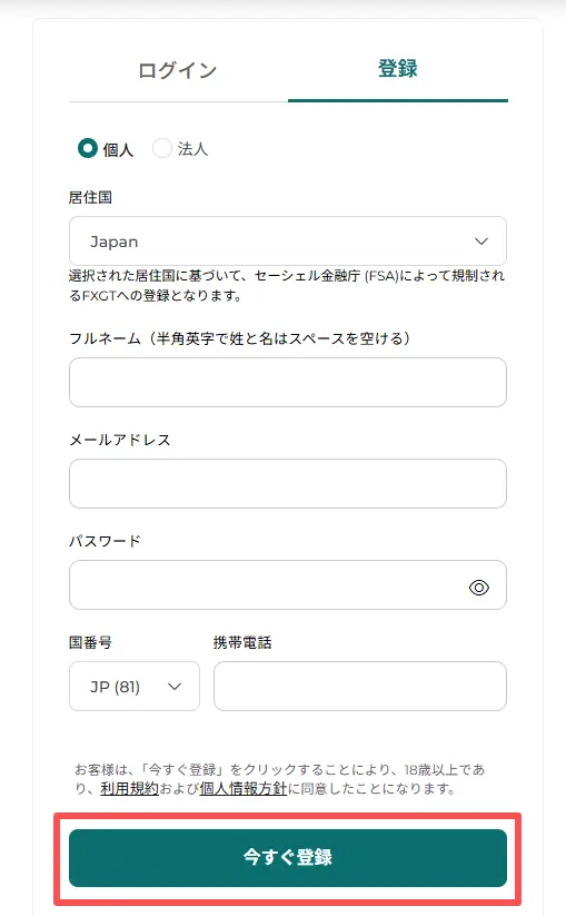 まず、以下のリンクからFXGTのアカウント申請ページにアクセスして⼿続きを開始してください。